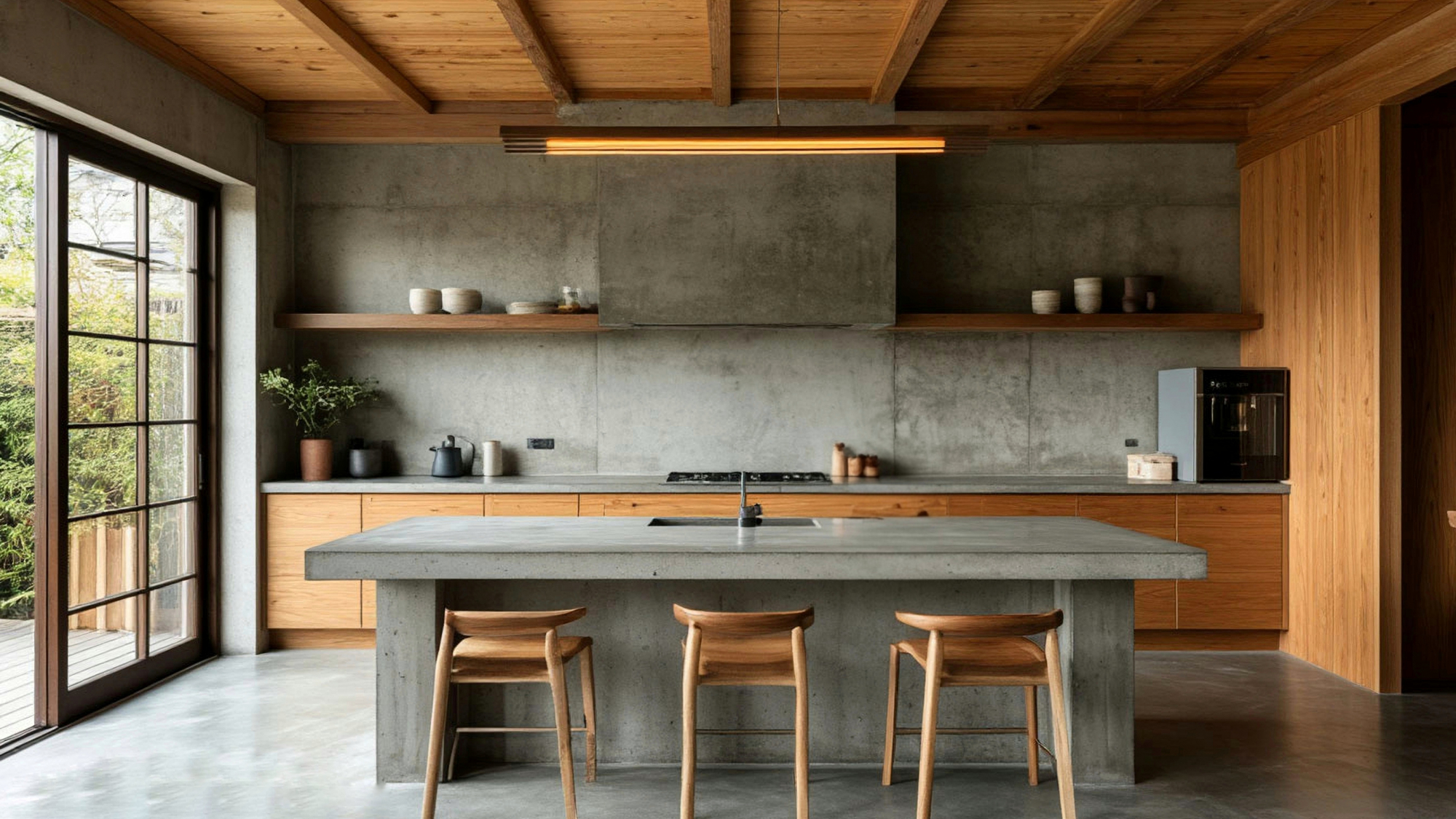 Освещение играет ключевую роль в раскрытии красоты кухни "Камури". Продуманная система освещения позволяет создать разные настроения в интерьере: дневной свет подчеркивает текстуру бетона и древесины, добавляя объема и глубины, а мягкая подсветка вечером создает уютную атмосферу, в которой приятно проводить время. Световые акценты помогают выделить рабочие зоны и сделать кухню более функциональной.