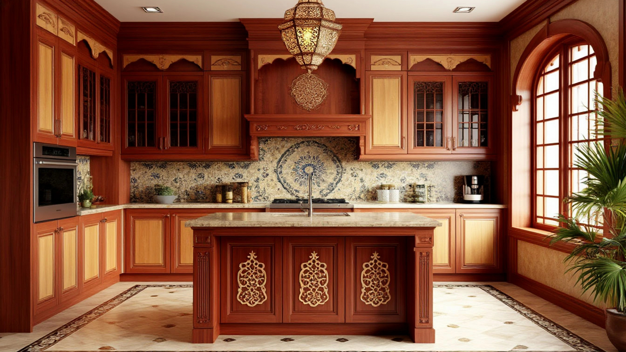Фасады кухни "Шафран" выполнены из МДФ, что позволяет реализовать сложные декоративные элементы, характерные для восточного стиля. Резные детали, рамочные конструкции и аккуратные орнаменты выглядят выразительно, но не перегружено. Здесь важен баланс: декоративность присутствует, но она выверена и гармонична. Каждый элемент фасада подчеркивает общий стиль, создавая цельный и завершенный образ кухни, в которой нет случайных деталей.